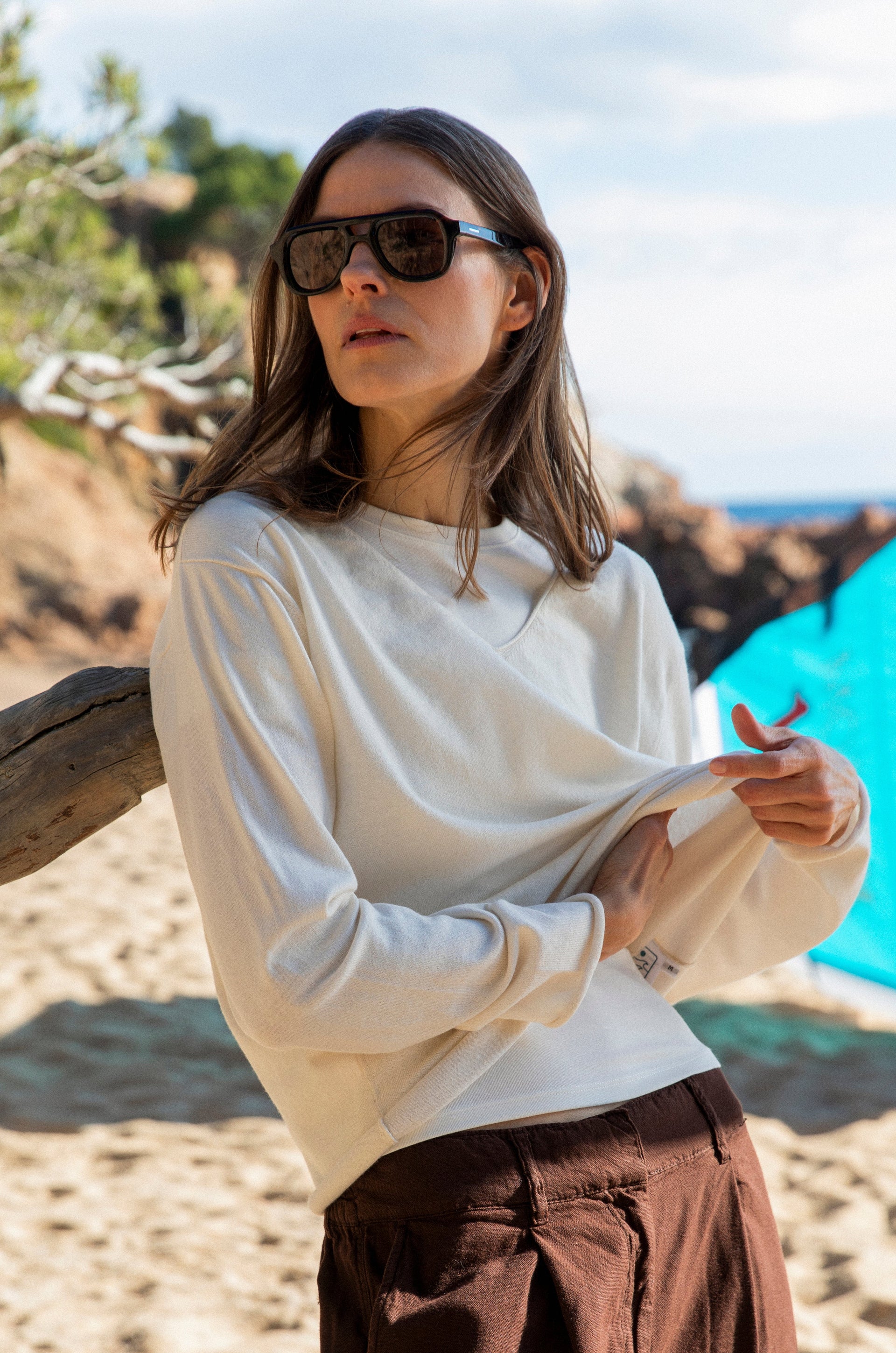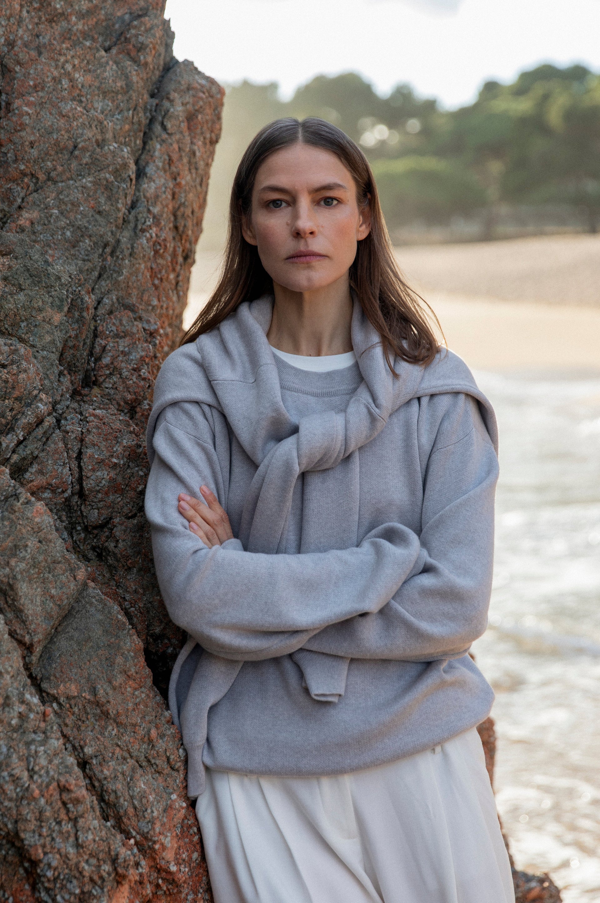 A cotton–cashmere knit with a deeper, more substantial feel, offering softness with gentle structure. The relaxed silhouette invites layering and slow movement, designed for cooler air, early mornings, and long transitions between sea and land.