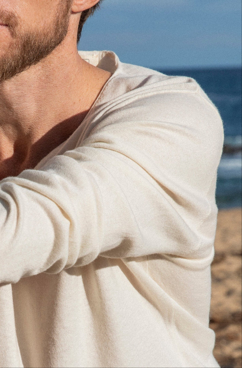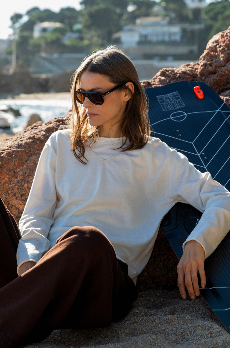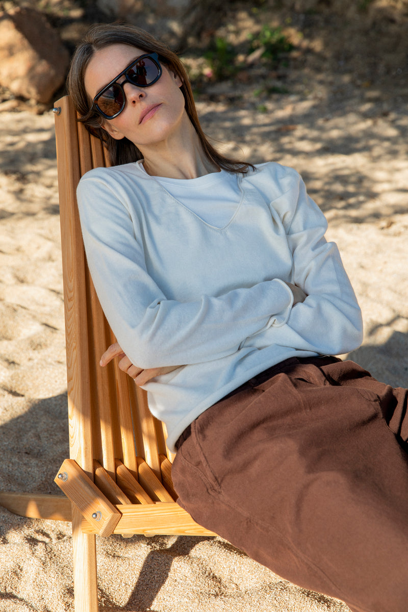 Made from a cotton–cashmere blend, the fabric feels soft against the skin while holding its form. A relaxed V-neck silhouette with clean lines, designed to move easily and wear effortlessly.